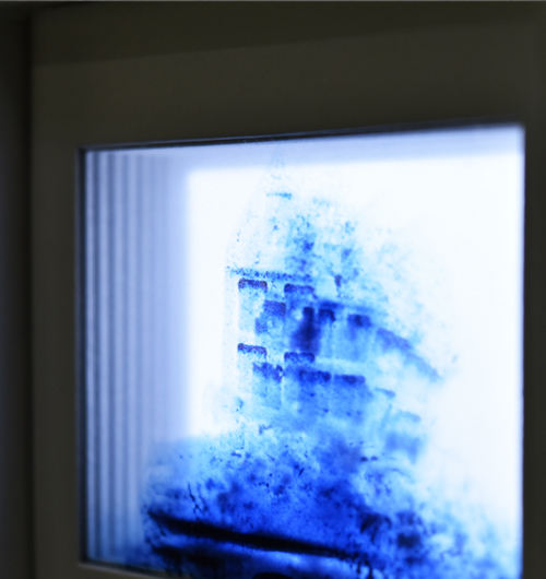 それらのフィルムをスライドフィルムのマウントに収め、層のように重ねることで、ストップモーションアニメのフレームを物質として保存した状態をつくりました。