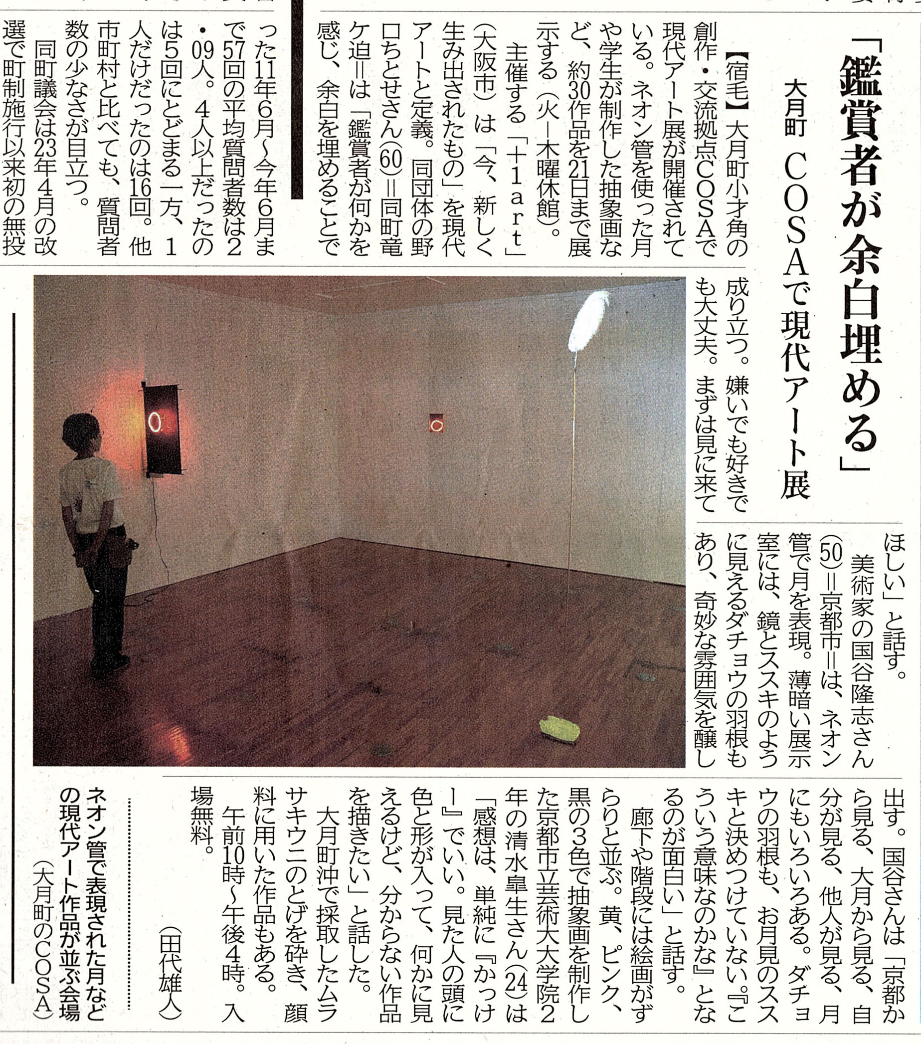 今年は、京都市立芸術大学で日本画を指導する谷内春子と大学院生たち、ネオン菅をはじめ様々な素材で空間を創り出すアーティスト国谷隆志を招き、「絵になる大月のウニとネオン管の月」と題した展覧会を大月町文化教育交流拠点COSAで開催します。