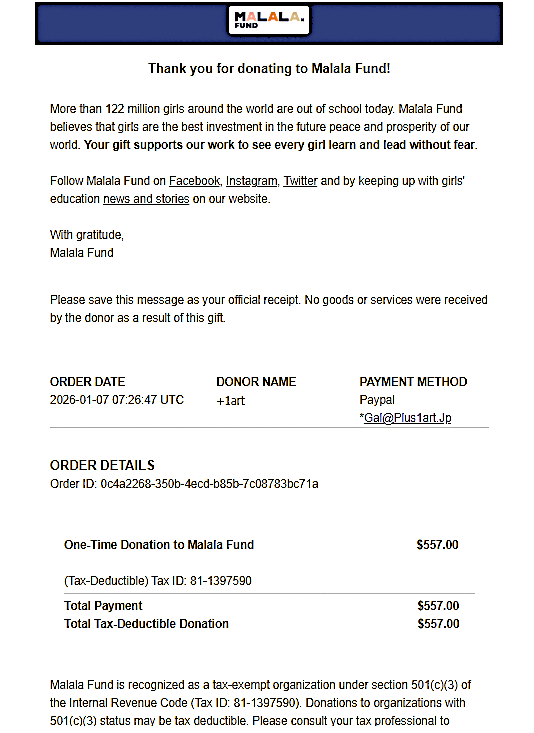 マララ基金への寄付金は、落札総額769,000円の10%に加え、