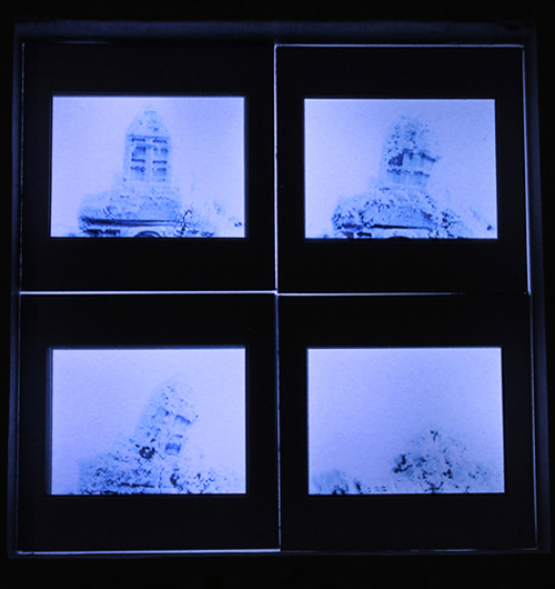 それらのフィルムをスライドフィルムのマウントに収め、層のように重ねることで、ストップモーションアニメのフレームを物質として保存した状態をつくりました。